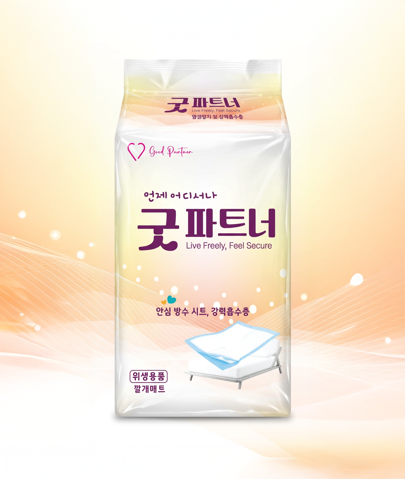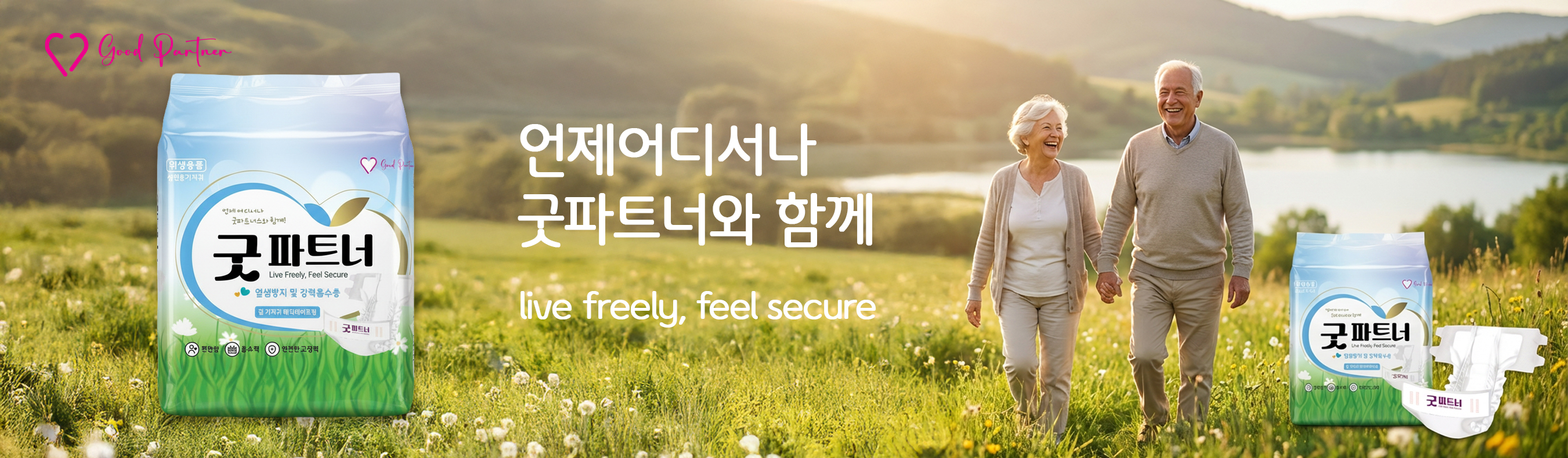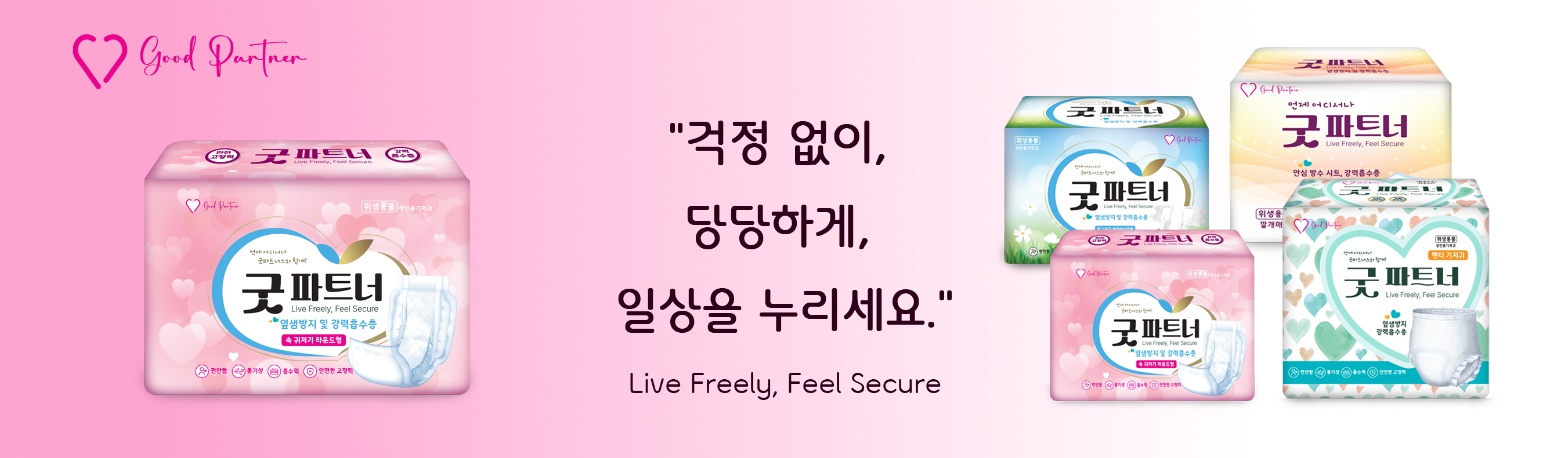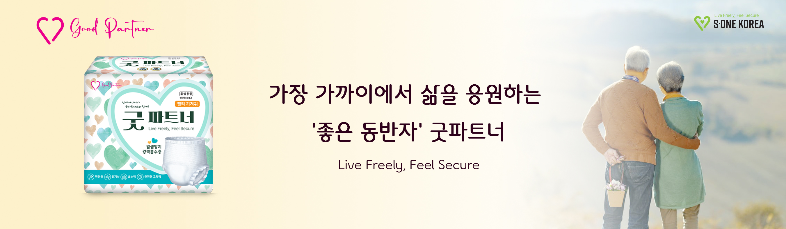 (주)에스원코리아는 '굿파트너' 브랜드를 통해 성인용 위생용품이 필요한 모든 분들께 삶의 질 향상과 존엄성 유지를 위한 최고의 솔루션을 제공하고자 합니다. 단순한 제품이 아닌, 여러분 가장 가까이에서 삶을 응원하는 '좋은 동반자가 되겠다는 사명으로, 끊임없이 연구하고 개발합니다.